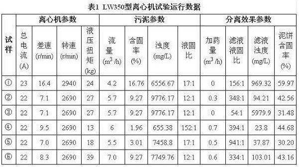2010年10月底,公司選用麗水市恒力離心機(jī)械設(shè)備有限公司的LW350A型臥螺離心機(jī)對(duì)循環(huán)水污泥進(jìn)行了定性試驗(yàn),LW350A型離心機(jī)的主要參數(shù)為:螺旋差速10~30r/min、轉(zhuǎn)鼓轉(zhuǎn)速2800r/min、電機(jī)功率55kW。絮凝劑選用濃度為1.5‰的陰離子型聚丙烯酰胺,試驗(yàn)數(shù)據(jù)見(jiàn)表1。