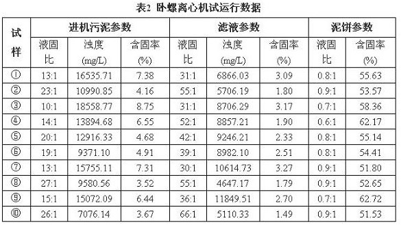 試運(yùn)行期間,進(jìn)機(jī)污泥參數(shù)變化不大,離心機(jī)各項(xiàng)參數(shù)基本保持為:污泥流量20m3/h、差速8r/min、轉(zhuǎn)速1800r/min、主機(jī)電流30A。試運(yùn)行數(shù)據(jù)見(jiàn)表2。