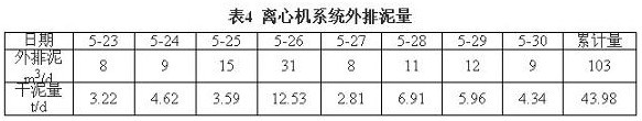 2009年4月24日,新建臥螺離心機(jī)項(xiàng)目投入試運(yùn)行,試運(yùn)行工藝流程大致同圖2,離心機(jī)上清濾液不經(jīng)過(guò)溢流水箱和溢流水泵到16米沉降槽,直接經(jīng)過(guò)排水管排入下水道。
