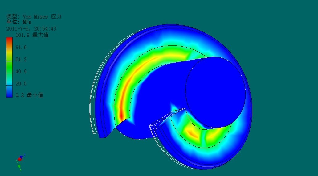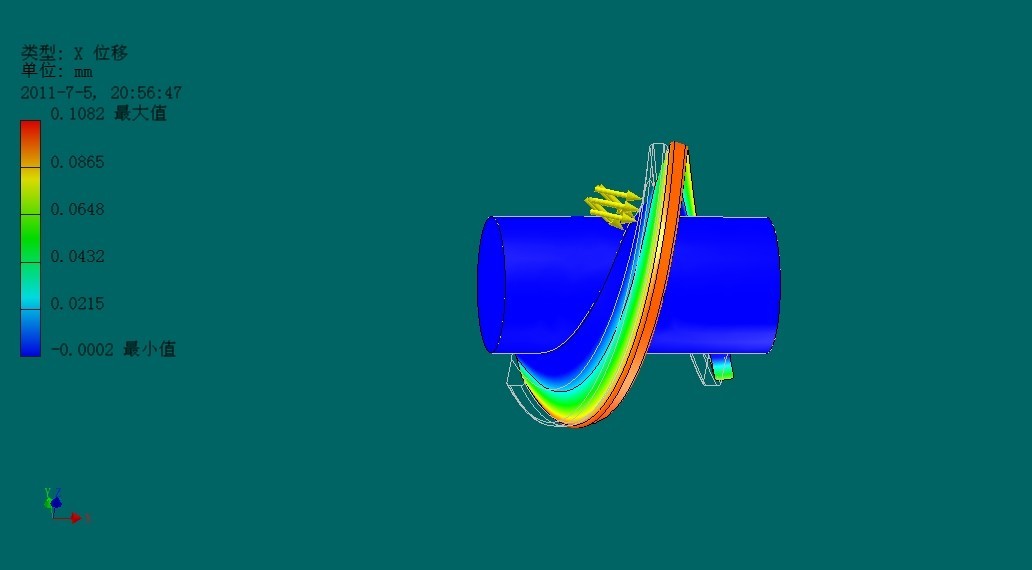 下面我們通過對螺旋葉片施加一定的載荷,來反映在工作狀態(tài)下螺旋葉片最大應(yīng)力和變形發(fā)生的位置。下面我們從ANSYS有限元分析的結(jié)論圖中選定:Von Mises 應(yīng)力(Von Mises 應(yīng)力是基于剪切應(yīng)變能的一種等效應(yīng)力,其含義是單元體形狀比能達(dá)到一定的程度)和X方向上的位移這兩幅分析圖,既可以清楚反映葉片的根部應(yīng)力值最大的問題,同時從位移圖中可以看出葉片外端部所受的位移變化之最大。